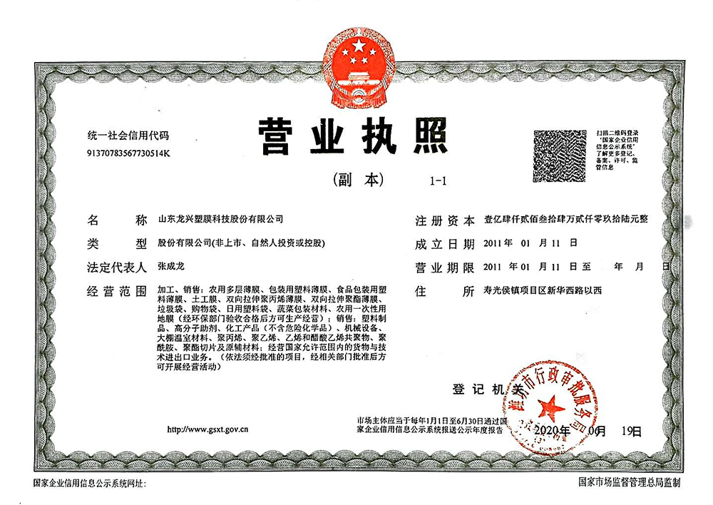 山東龍興塑膜科技股份有限公司前身為山東壽光龍興農(nóng)膜有限公司組建于2011年,2018年10月重組,目前是壽光市國有控股公司、高新技術(shù)企業(yè),是專業(yè)生產(chǎn)高檔農(nóng)用薄膜、工業(yè)用薄膜的企業(yè),是一家以產(chǎn)品制造為主,集科研開發(fā)、產(chǎn)品設(shè)計(jì)、技術(shù)服務(wù)于一體的綜合性企業(yè)。公司現(xiàn)有職工228人,各類工程技術(shù)人員97人,管理人員20余人,注冊資金14234.2096萬元,總資產(chǎn)102314萬元,目前是壽光市國有控股公司、高新技術(shù)企業(yè)。公司是中國塑料加工工業(yè)協(xié)會(huì)農(nóng)膜專業(yè)委員會(huì)會(huì)員單位,中國復(fù)合材料工業(yè)協(xié)會(huì)會(huì)員單位,中國塑料加工工業(yè)協(xié)會(huì)雙向拉伸聚酯薄膜專業(yè)委員會(huì)會(huì)員單位...